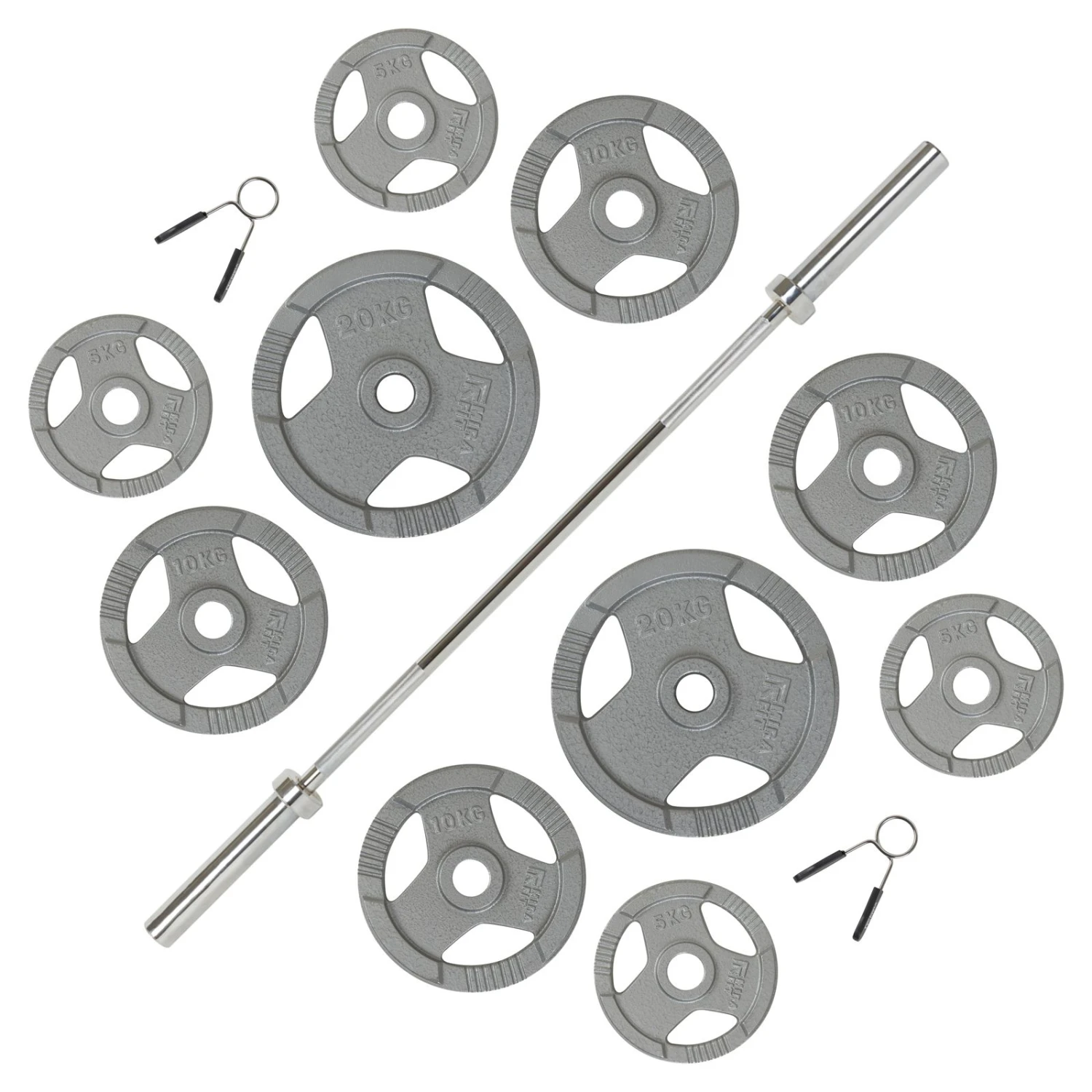 - Includes 5ft Olympic barbell, 4x 5kg weight plates, 4x 10kg weight plates, 2x 20kg weight plates & spring collars